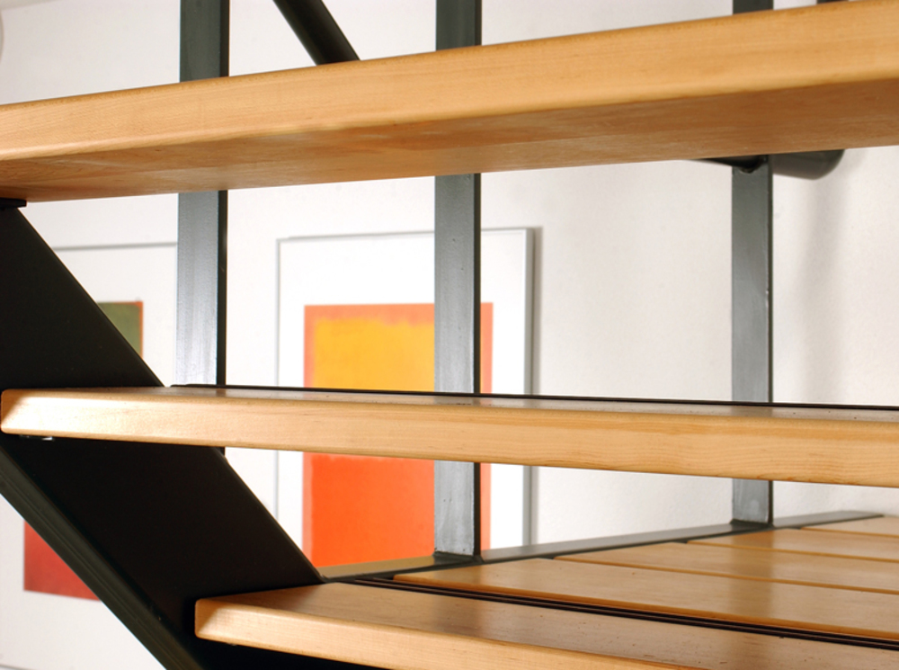 Voor een kantoor in Sliedrecht maakten we een gloednieuw trappenhuis. In dit geval gaat het om een trappenhuis met twee steektrappen en een bordes, ook wel een tweekwart trap genoemd. We hebben de treden uitgevoerd in blank gelakt hard maple, ook wel Amerikaans esdoorn. Omdat er veel op deze trappen gelopen wordt, zijn twee doorlopende zwarte antislipstrippen geplaatst. Gemoffeld stalen trapbomen, balustraden en leuningen maken het plaatje helemaal af.