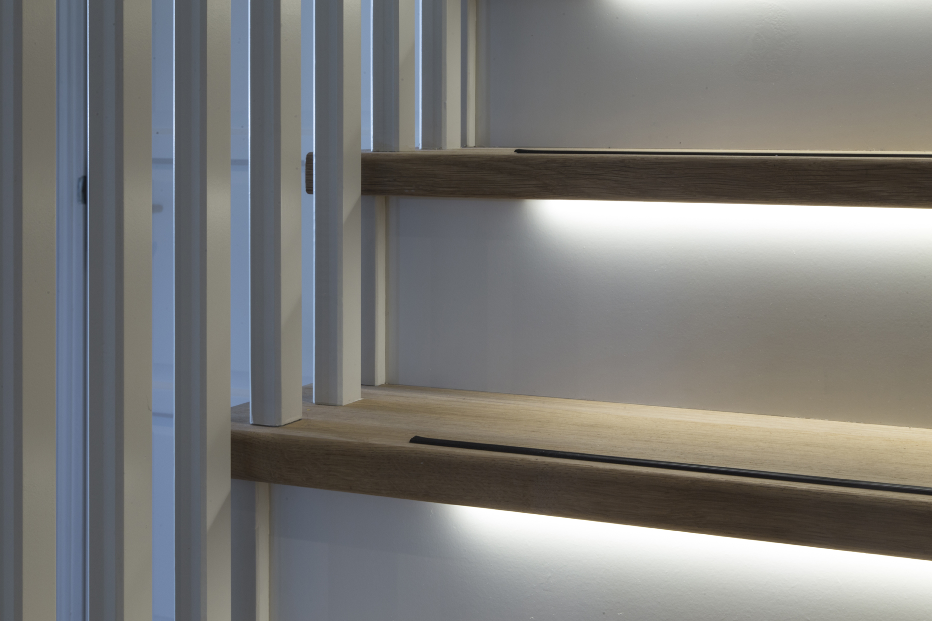 Je hebt trappen en je hebt trappen. Deze zal u ongetwijfeld bijblijven. Deze moderne trap met ledverlichting en bloktrede is een echte blikvanger! De treden zijn van eikenhout, de trapbomen van wit gelakt mahonie. Het gaat hier om een bovenkwart trap met bloktreden. De trapbomen zijn uitgevoerd als keepbomen. Onder de treden zit ledverlichting met sensoren, zodat u altijd goed zicht heeft op de treden. Om de veiligheid verder te vergroten, is een ophoudende zwarte rubber antislipstrip aangebracht.