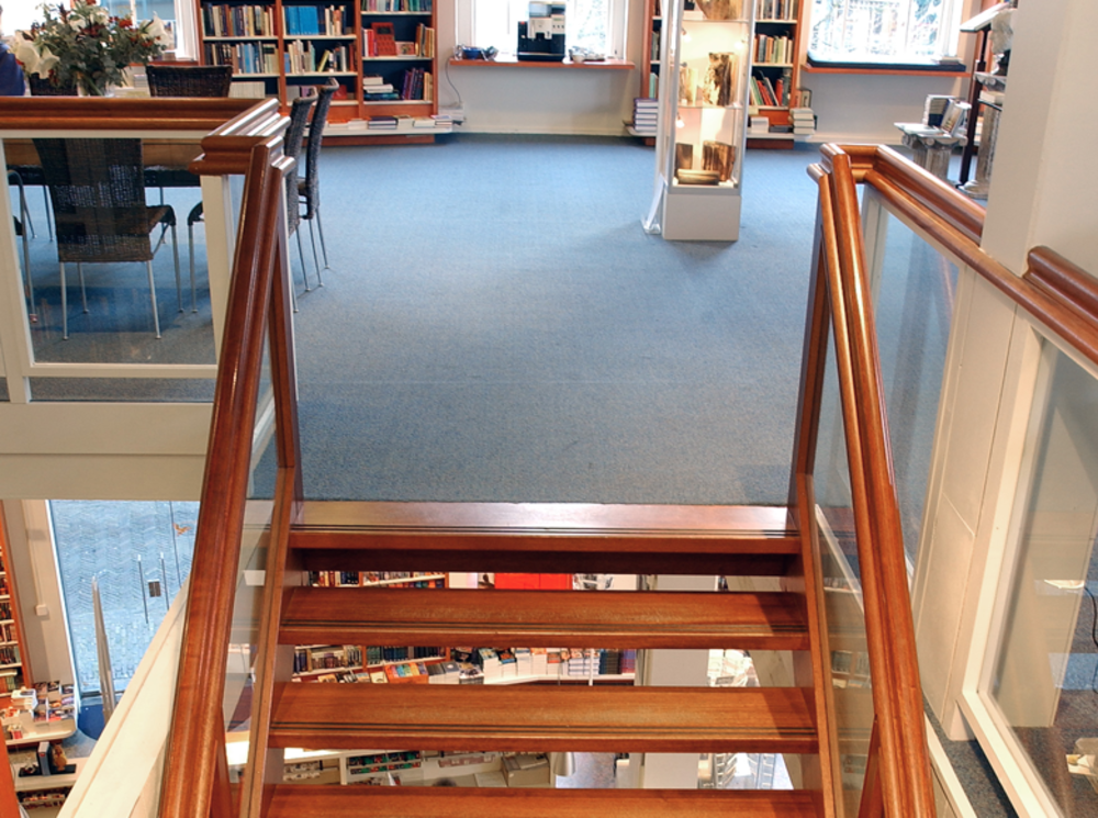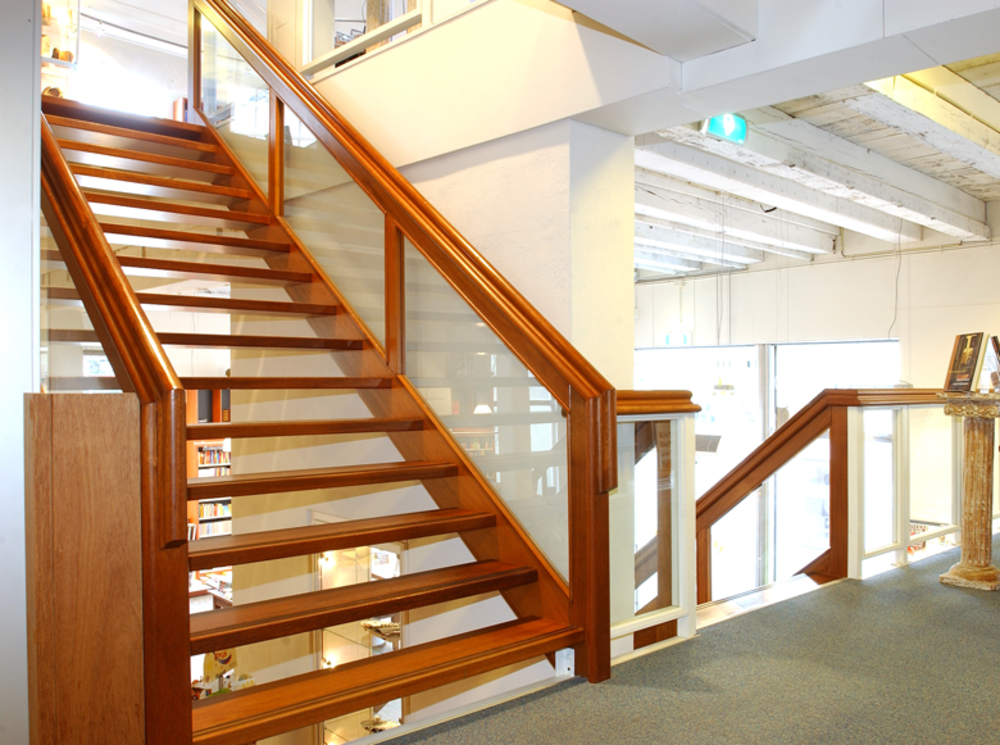 Heerlijk snuffelen tussen de boeken in een winkel met meerdere verdiepingen en dus een heleboel boeken. Daar hoort een stevige en goed beloopbare trap bij. Voor deze boekwinkel in Deventer plaatsten wij een steektrap met videhekken. De gebruikte houtsoort is Merbau. Door geen stootborden te gebruiken, is er altijd goed zicht op andere verdiepingen. Twee doorlopende grijze antislipstrips zorgen ervoor dat uitglijden niet mogelijk is. Verder zitten er glazen panelen in de hekken verwerkt op de trap en langs de vide, voor nog meer transparantie. De glazen panelen zijn voorzien van een geprofileerde bovenregel.