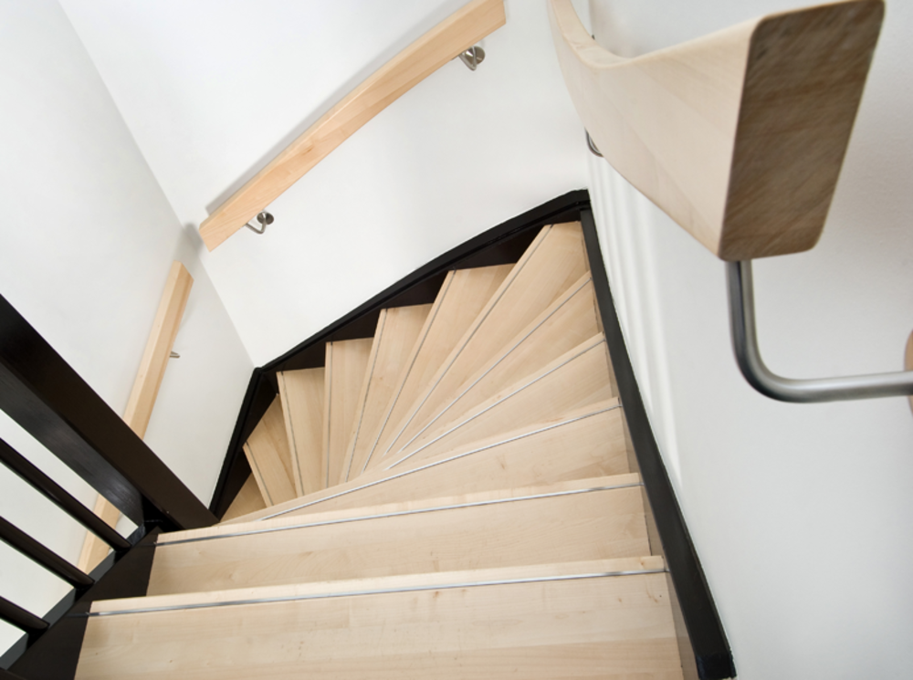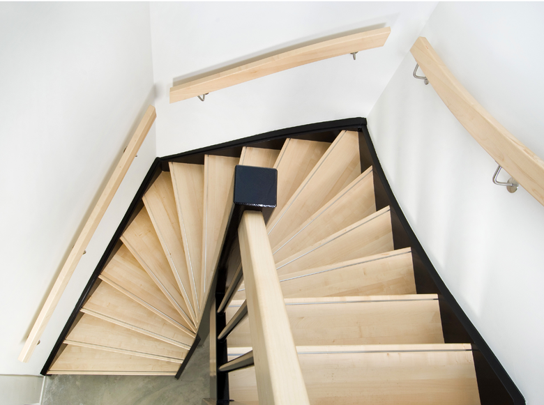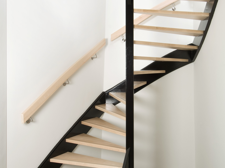 Spelen met verschillende houtsoorten kan hele mooie contrasten opleveren. Dat is zeker te zien bij deze spiltrap voor een communicatiebureau in Oudewater. Het esdoorn voor de treden is een mooie, lichte en toch zeer harde houtsoort. Voor de andere onderdelen gebruikten we vurenhout dat later zwart is afgelakt. Het is een open trap zonder stootborden. Om te voorkomen dat iemand uitglijdt, hebben we antislipstrips van rvs geplaatst. De spijlen in het hekwerk zijn rechthoekig en de muurleuningen plat uitgevoerd. Een rustig ogend en toch stijlvol geheel.